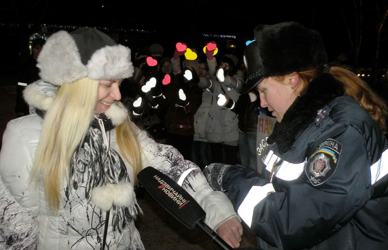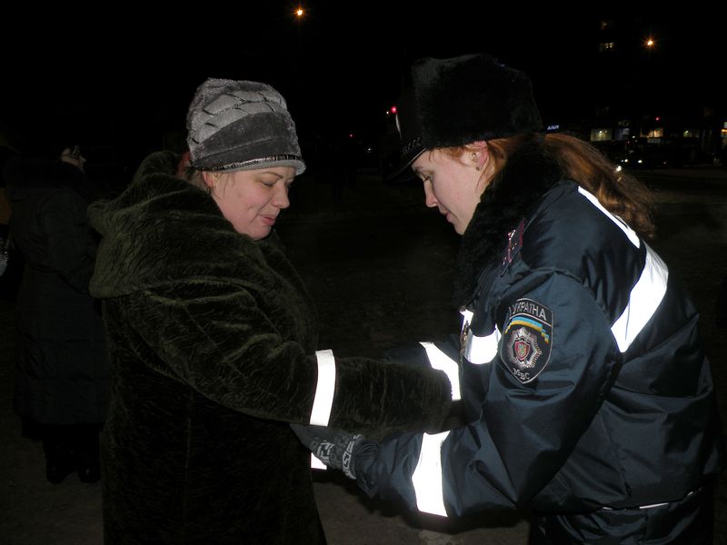 – В связи с тем, что в темное время суток происходят дорожно-транспортные происшествия с участием и по вине пешеходов, мы хотели бы завязать светоотражающую ленту, чтобы Вы были заметны на дороге, – говорит инспектор профилактической работы УГАИ УМВД Украины в Николаевской области Юлия Волгина.