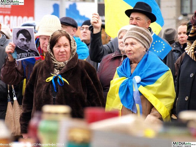 Численность собравшихся только увеличивается. Неоднократно звучал гимн Украины, вспоминали погибших, выступали активисты партий и организаций Днепропетровска. Лозунгами вече стали “Путина – геть!”, “Россия вставай!”, “Ми – не хохли, ми – українці!”, “Крим – це Україна”.