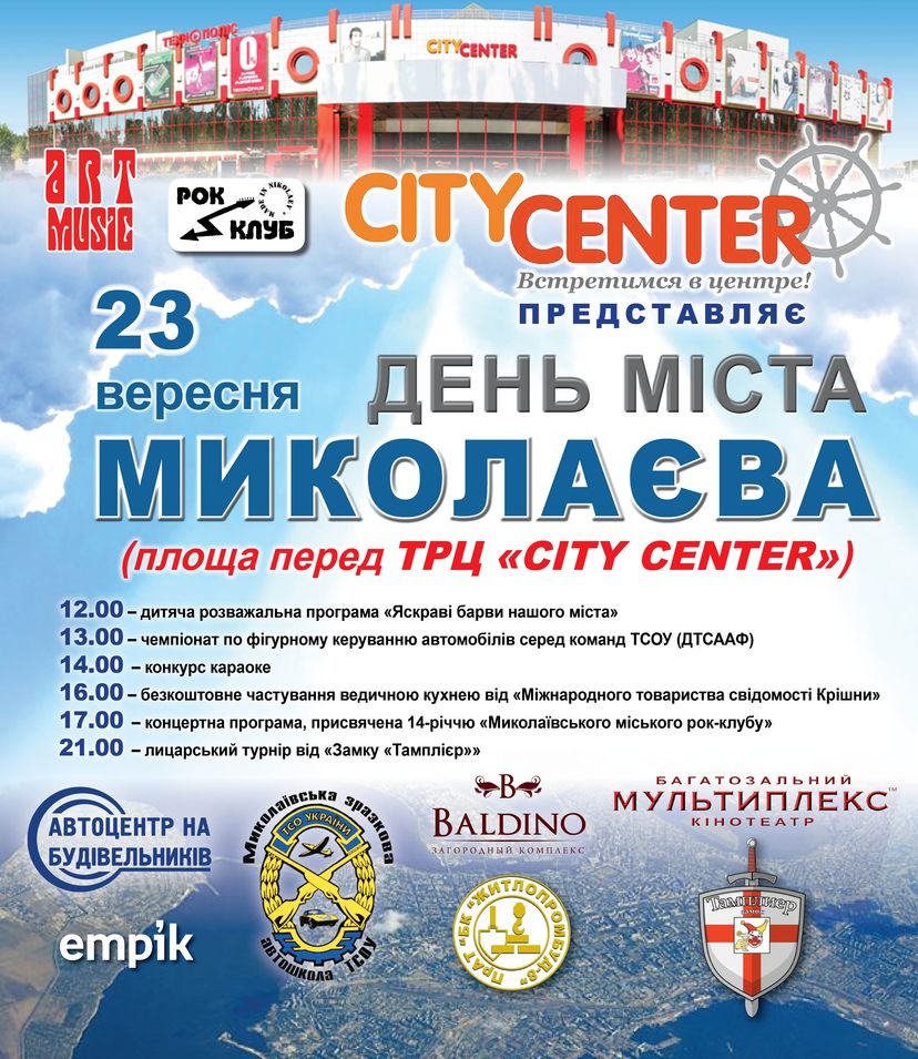 Торгово-развлекательный центр “CITY CENTER”, компания «Арт-Мюзик» и “Николаевский городской рок-клуб” приглашают всех жителей Николаева 23 сентября на празднование Дня города Николаева на площади перед ТРЦ “CITY CENTER”.